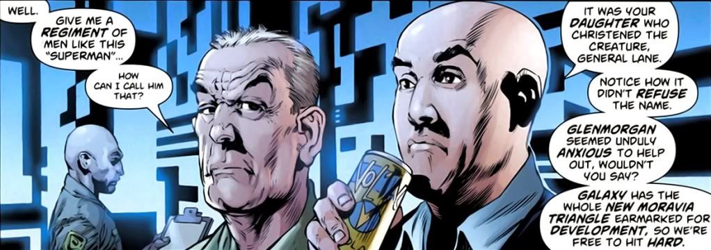 All we learn about Luthor is that he’s an expensive consultant to the military, who’s helping them to capture Superman. He’s behind the tanks, the use of the wrecking ball on the impoverished residents and apparently set up the Glenmorgan thing too. Lex also gives a cool speech to help us understand why he doesn’t like Superman. Have you heard the story of how when frogs were introduced to Australia, they ended up wiping out the native animals? I think that was on The Simpsons too.  But basically Lex is going with the whole idea that an alien lifeform introduced into a biosphere will ultimately destroy that biosphere. I’ve always enjoyed the more intelligence based reasons for Lex hating Superman. Though in this comic, Lex is very ho-hum about the whole thing.