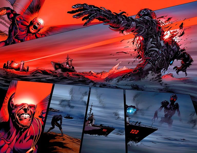 On the next page, Cyclops shoots first. The fight is on, and it’s a brutal one. Claws and optic blasts fly as the two men scrape on the beach, with the super-Sentinel looming just above them, having finally reached the island. End issue.
