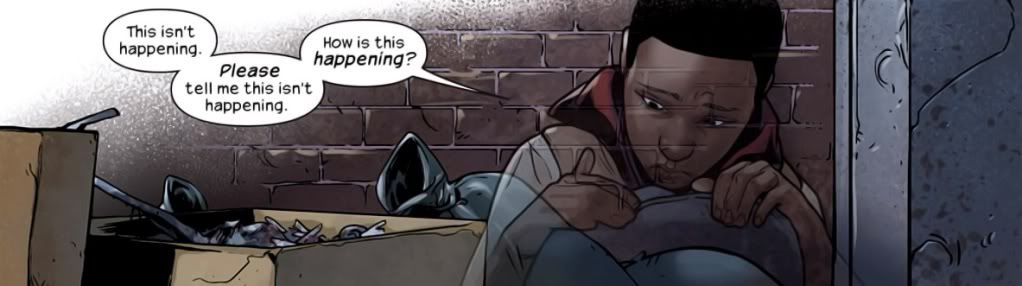 That’s a great way to start off this new character. Miles is not going to immediately run out and be king of New York. He’s only about 13-years-old, I think. He’s scared and the people were freaking out. So it’s very understandable that he’d be scared. Definitely helps the reader identify with him and get the readers on his side. You just want to tell him it’s going to be OK.