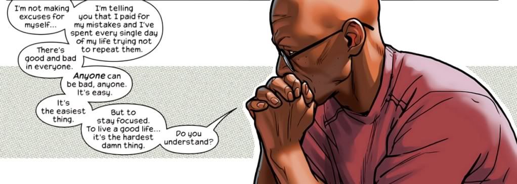 Once again, decompression is the name of the game. Bendis is taking his time introducing us to new star Miles Morales, and he’s also taking the time to introduce Miles to his new spider-powers. We all saw Miles get bitten by the bug last issue. Now it’s time to see what that means. I do not mind the decompression, especially not from Bendis. He practically introduced the concept to the world of comics with the original Ultimate Spider-Man. He writes great dialogue and really delves into the personality of his characters. Unfortunately, we only get a taste of Bendis’ usual snappy banter in this issue. Too much is given over to a long speech by Miles’ father. It’s a nice speech, but we don’t yet know the character enough for it to matter.
