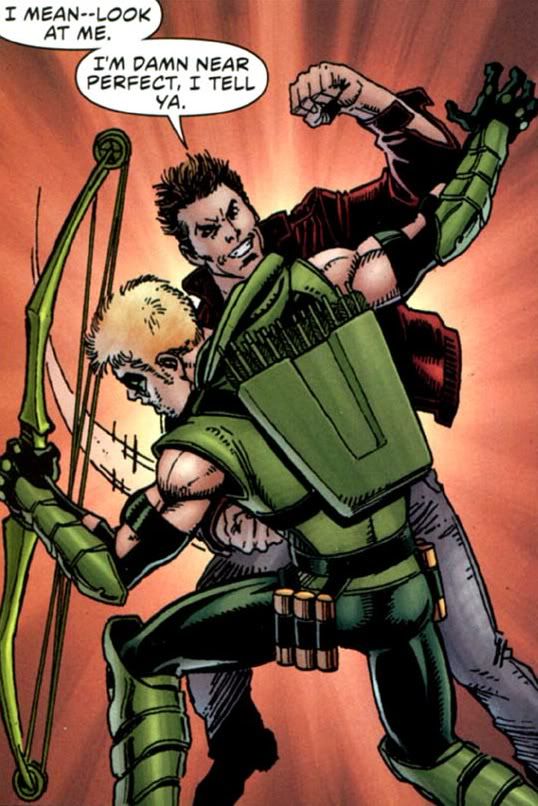 Now that’s what I call a punch! And check out that jacket! I can tell that Rush means business because he leaves it hanging open like that. You can see his hairless chest and everything. And those jeans, that hair; Rush is badass! I don’t even know what Green Arrow thinks he’s going to accomplish. All he’s got are bows and arrows, right Rush?