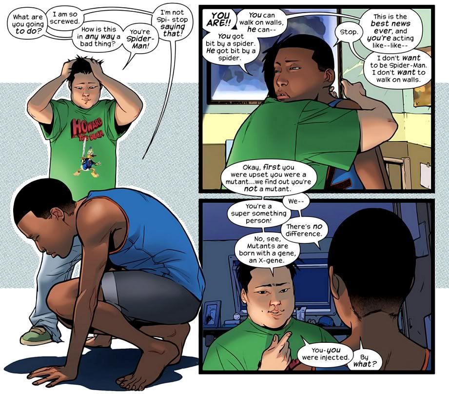 Miles doesn’t want to become a superhero just because it’s awesome. We don’t yet know what propels Miles to become the new Spider-Man. But when he does, it will matter so much more because we already know why he didn’t become Spider-Man as soon as he got his powers. This is the sort of characterization that turns a story into a classic.