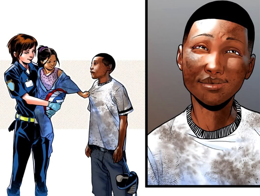 Miles leaps to the ground with young child in his arms. The paramedics rush to help the girl, and there’s a fantastic little scene where the girl tugs on Miles’ shirt before she’s taken away. The smile on Miles’ face is brilliant.