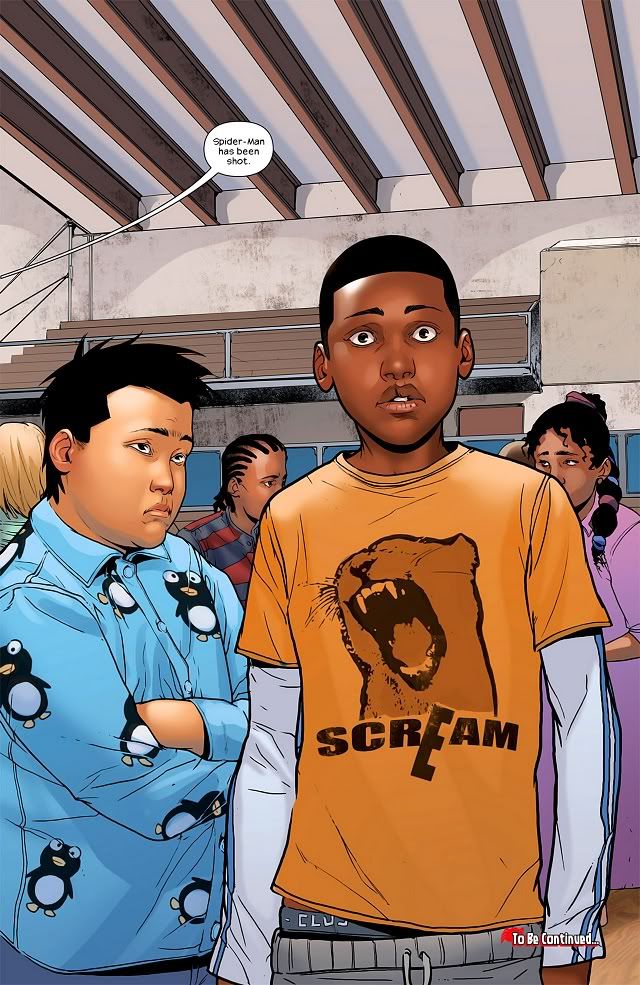 So all the students are brought into the gymnasium because Spider-Man’s death involves a big super-villain attack in New York City. The Ultimates are there, and the Sinister Six, basically it was a huge fight scene where Peter heroically fought to the very end. Miles and his classmates are told not to panic, that they should be safe. Reports are coming in…and Spider-Man has been shot.