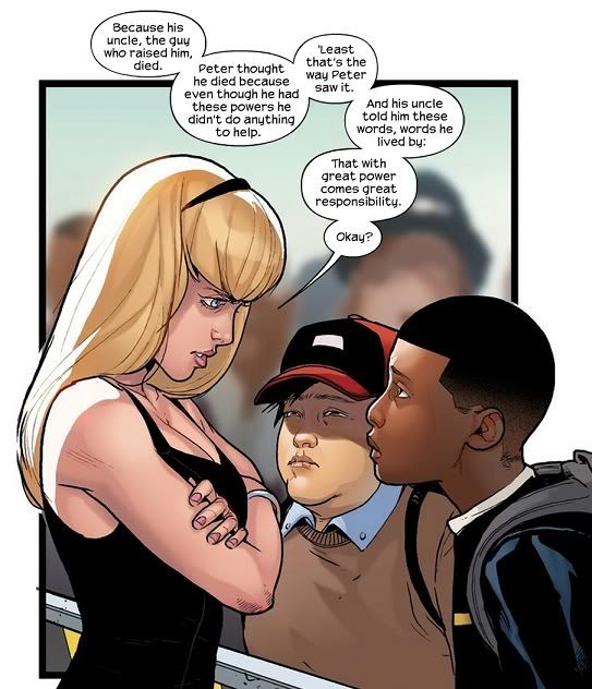 This scene rubbed me the wrong way. It’s a little heavy-handed. Obviously this part wasn’t shown in Ultimate Fallout #1, the whole thing where Gwen starts huffing and puffing at the two kids in the crowd. Personally I like to think that Miles just wanted to talk with the pretty blonde girl. Other than that, it’s just a forced introduction between Miles and Peter Parker’s motto.