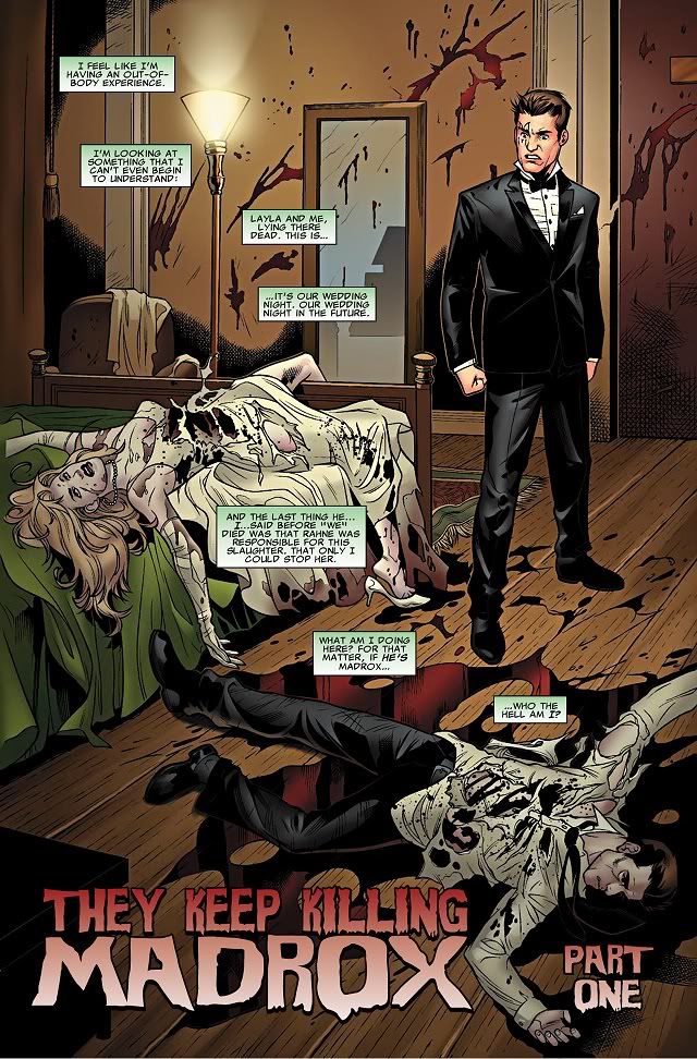 We open where we’ve left off in the last two issues, with Madrox standing over the dead bodies of himself and Layla Miller. Somehow he has been transported to another dimension following his death at the hands of Bloodbath. In this new reality, Layla and Madrox just got married, and our Madrox shows up just in time for his counterpart to tell him that Rahne Sinclair was the killer. Somehow, our Madrox is also suddenly wearing a tuxedo.
