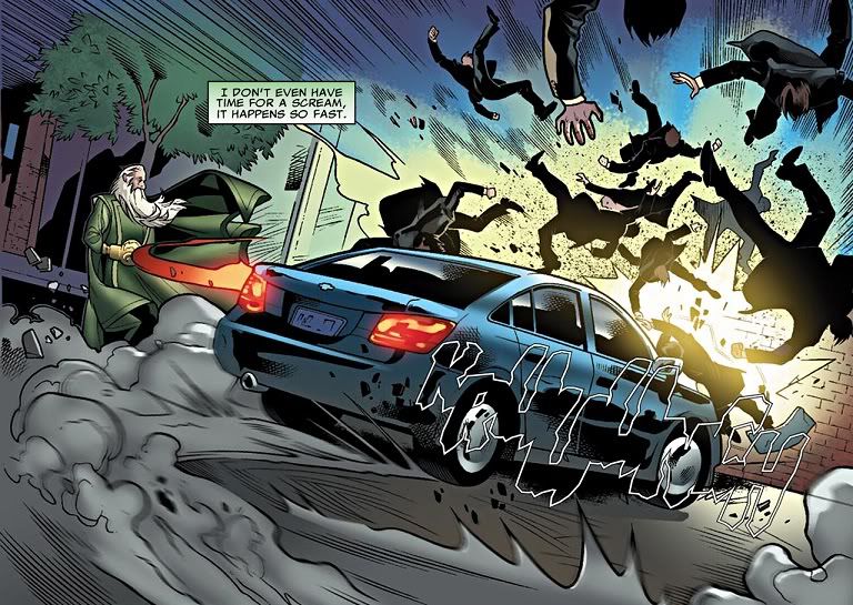 Madrox’s body is slammed against a brick wall, and he slumps against the hood, dying. The driver is revealed to be Val Cooper, who you may recall was the topic of conversation for Rictor and Terry at the bar are the reception. Val had too much to drink, and now she’s run down Madrox!