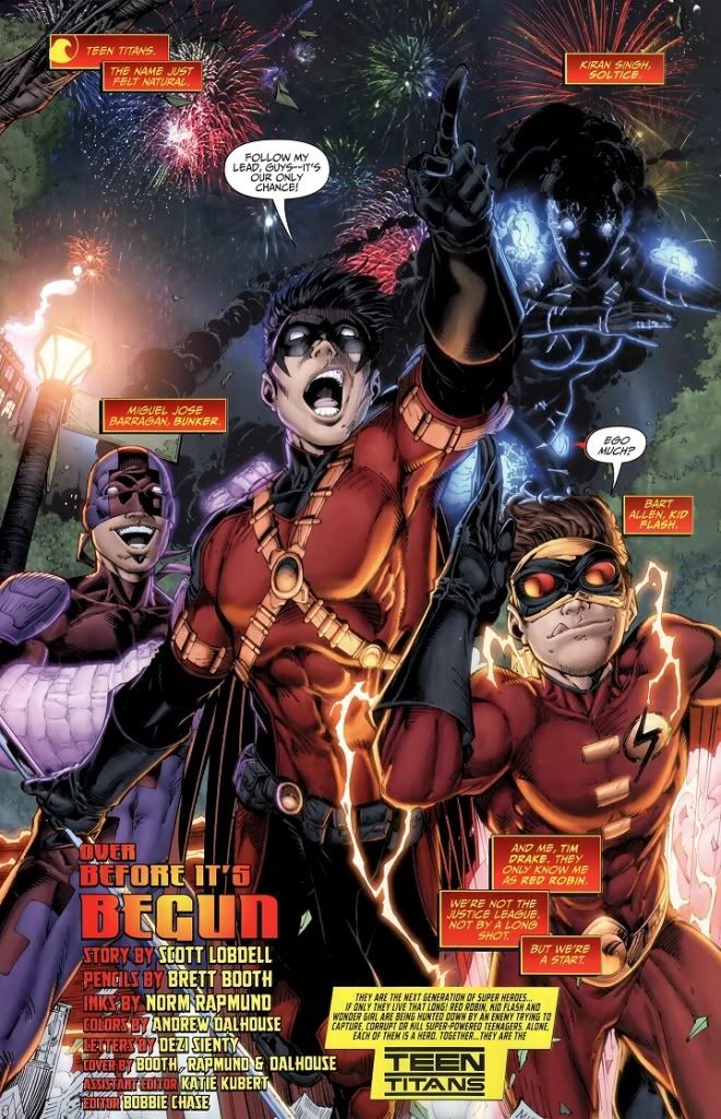 There is too much red in this book. It’s ridiculous. Almost every character uses red and black as the colors of their costume. Can’t the team be more colorful or diverse? Solstice is black. Bunker is purple with dull red highlights. And Kid Flash, who should be wearing yellow (and red) is wearing an old Robin costume on the cover. I know that was the joke from last issue, and he’s wearing that costume in this issue, but I would have forgiven everybody involved had they put him in his Kid Flash costume on the cover. I know he doesn’t have it yet in the comic, but they should have done it for the sake of a pleasing cover.