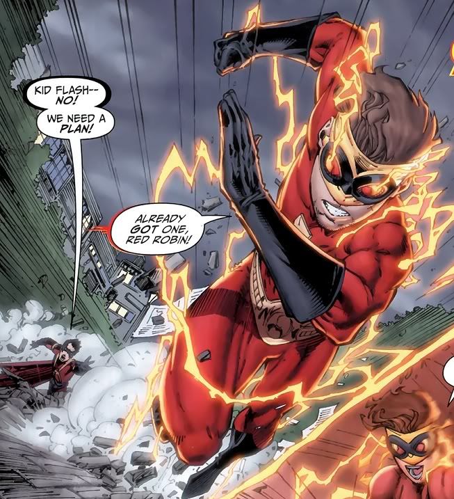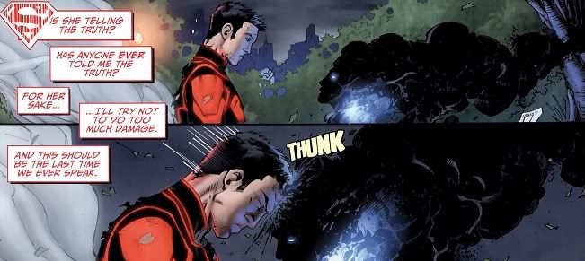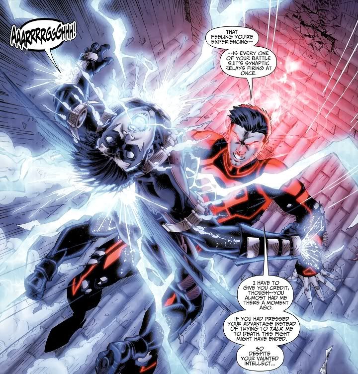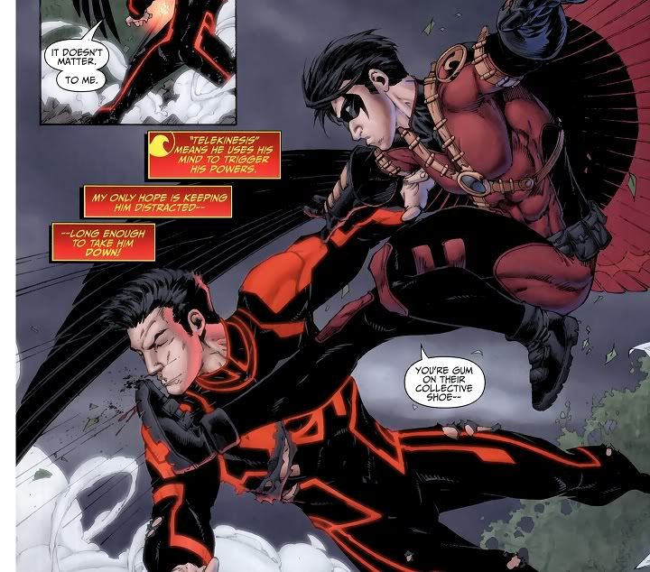 Of course, all this gives Superboy plenty of time to strike back and use his powers to flash-fry every electrical gadget in Red Robin’s costume.