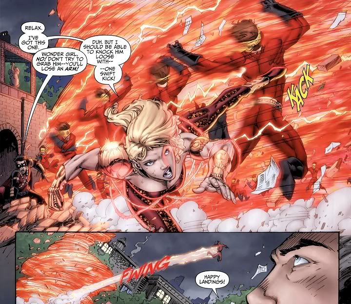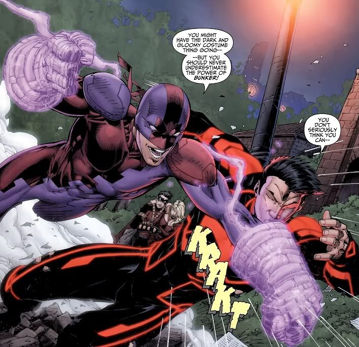 Solstice is dispatched to try and catch the falling Kid Flash. Then Bunker takes his turn at Superboy.