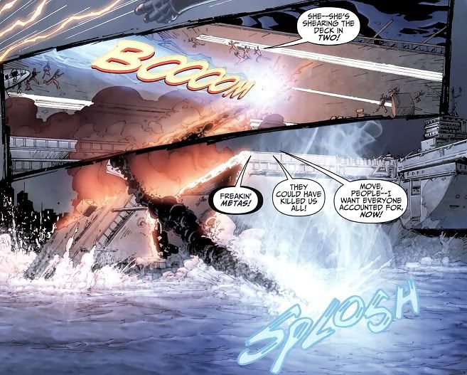 Wow! Like a hot knife through butter, she just cuts off one end of this ship in the harbor so that she and Kid Flash don’t crash onto the deck. We hear the crew on the ship crying out in fear, evacuating, and then worried about survivors after their ship has been destroyed.