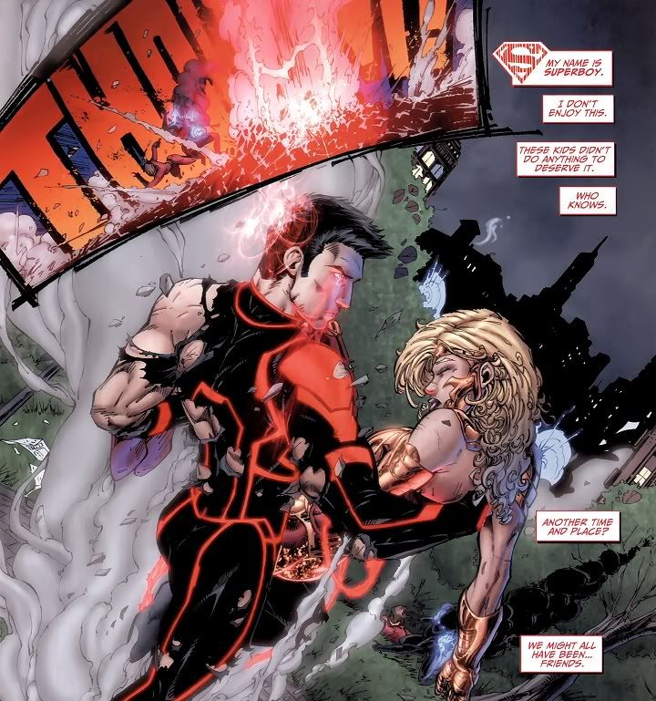 Tim Drake gets some kudos in that he knows how to approach Superboy and his tactile telekinesis, and is also able to get him down with a wing weapon to his neck. It looks like Red Robin has him beat! Even Wonder Girl is impressed at ‘Bird Boy’. But then Tim wastes a lot of time with a speech to Superboy about the horrors of N.O.W.H.E.R.E. It’s like a reverse super-villain. Tim has Superboy on the ropes, but starts monologuing about the good guys and about Superboy.
