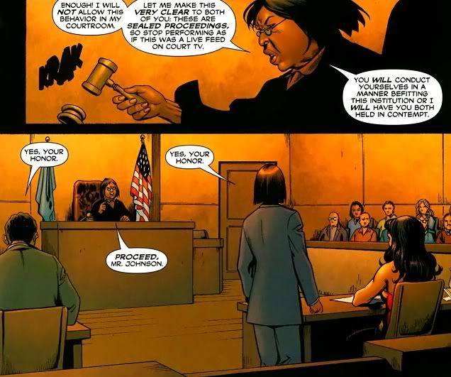 Instead of a trial, the story is actually about a grand jury, where the prosecutors must first present evidence to secure an indictment against a person. Once they have the indictment (an official list of charges), then they proceed to actual criminal court with pleas and a trial. To add to the drama, the writer just has Wonder Woman and Spencer sit in on the grand jury proceedings. They also throw in some superhero craziness with a shapeshifter, and Superman tells the judge about the doctored video.
