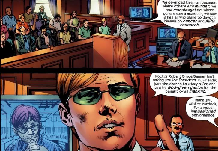 Banner had Daredevil as his defense attorney. If you remember your Ben Affleck movies, Daredevil is secretly blind attorney Matt Murdock, and he’s usually the go-to guy for legal representation in Marvel Comics. Murdock tries to argue that Banner was using a government-sponsored steroid (Banner worked for the government). He also argues that instead of the death penalty, Banner should get life in prison so he could use his vast intellect to help people and cure cancer – as opposed to using his smarts to invent Hulks.