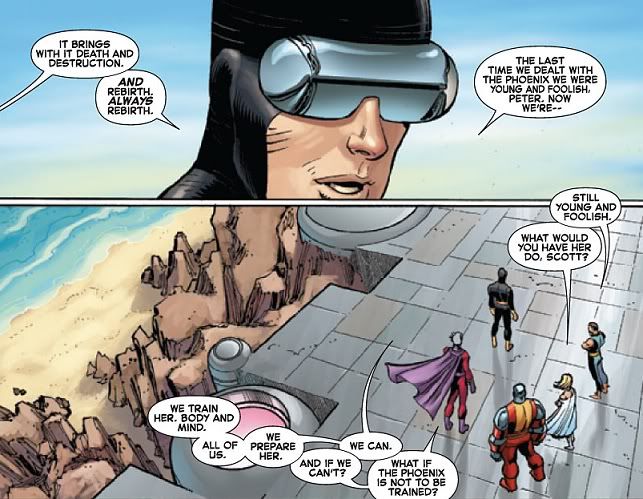 Emma tells Cyclops that training Hope to handle the Phoenix is Hope’s choice, not his. Cyclops does not immediately reply, and then their conversation is interrupted by the arrival of Captain America down on the shore. Emma senses him with her telepathy. He’s standing at the edge of the island and the ocean, and Cyclops goes out to meet him.