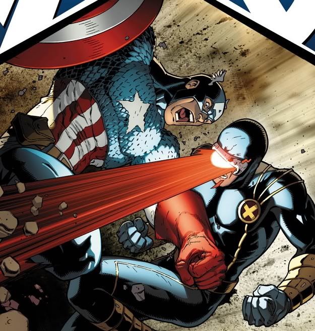 That picture isn’t exactly what happens, but I don’t have the scan. Cyclops lets loose with one of those massive optic blasts that takes up nearly the entire page. Cap blocks it with his shield, but is still launched backwards several dozen yards. The X-Men are shocked, but Cap clearly expected this. He picks himself up and says softly, “Avengers Assemble.”