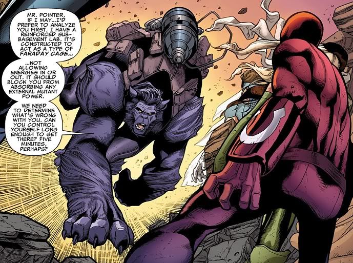 So Beast and his new lab partner extraordinaire team up to run some tests of Weapon Omega, and it turns out the dude is a bomb of some kind. Beast launches into his usual brand of sciencey jibber jabber, basically saying that Omega’s just gonna blow up. Simple as that. Hell, he might take everybody with him. Not cool, Beast. But science is science.