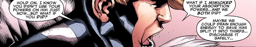 So if I can get this straight, Mimic mimics Rogue’s power absorption powers, and together Mimic and Rogue use her power absorption power to absorb the power absorption power of Weapon Omega. That makes total sense.