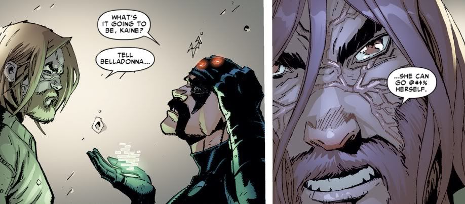 Booyah! Kaine is hardcore, and it’s awesome. He then takes out Flower and faces down Smithy, who tries to pull out some new guns, but can’t pull the trigger with his broken fingers. Kaine just walks up to Smithy,while the villain tells him that Belladonna won’t stop. She’ll send hundreds of assassins after Kaine. This he knows, so Kaine demands Smithy’s phone and calls Belladonna.