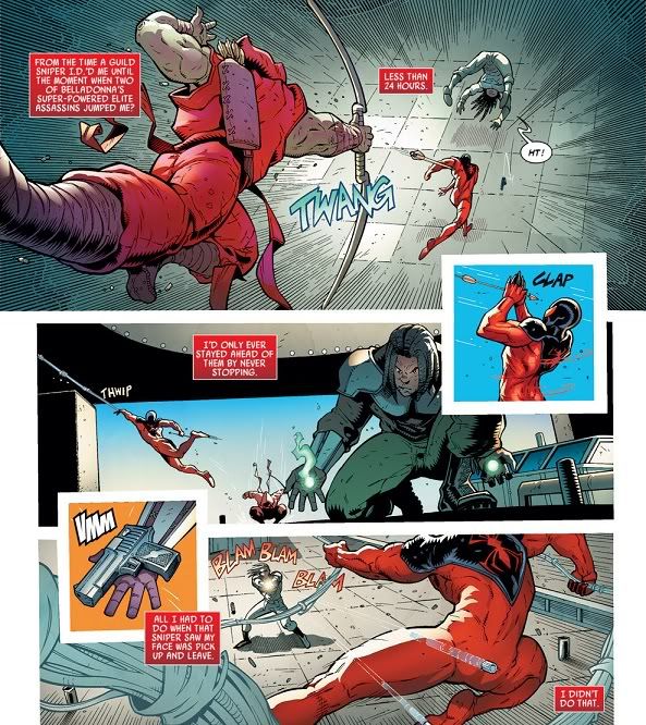 We then cut to present day Houston, where Kaine is engaged in battle with two members of the Assassin’s Guild. One of them is a Hand ninja with a bow and arrow, the other is a guy named The Smithy. Apparently he has the power to make guns appear in his hands from some unseen arsenal. Again, I have no clue if they’re established members of the Guild, or if Yost had free reign to create some new guys. Kaine is pretty badass when it comes to fighting. Check out this sequence: