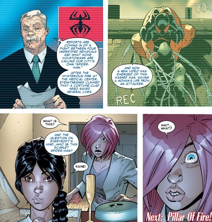 Back in the other room, Annabelle knocks on the bathroom door to see if Kaine’s OK. Aracley is watching the news, which shows footage taken last issue when Kaine stopped that mugger. Remember the guy in the other building filming? Of course you do. Anyway, that video coupled with the day’s fight have turned Kaine into a hero! The reporter is pro-superhero, reporting that Kaine saved people and the hospital. Then we finally get someone using the name ‘Scarlet Spider’.