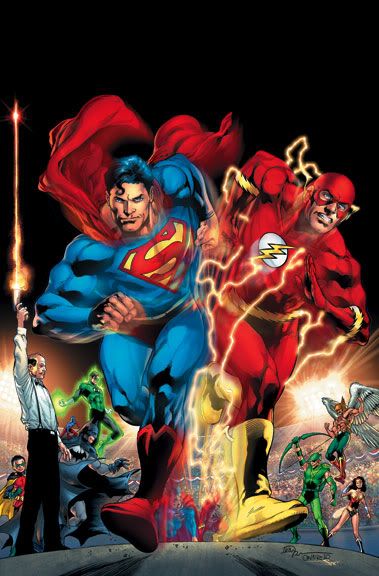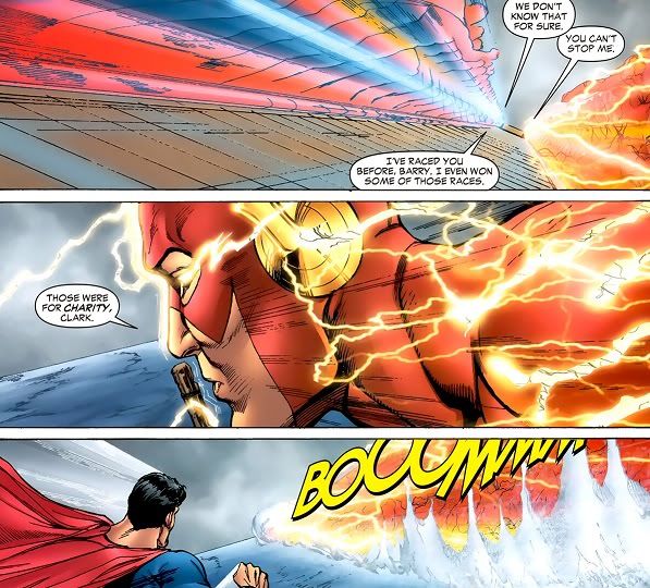 Except for the most recent race in Flash: Rebirth #3 in 2009. Popular Flash and Green Lantern writer Geoff Johns brought Barry Allen back from the dead and gave him a new profile as the one and only Flash. The story involves Barry being possessed by the spirit of death, with the Justice League trying to help him shake the oogie boogies in order to return to the land of the living. But Barry doesn’t want their help, he wants to just succumb and save everyone the trouble. So he flees, and Superman tries to keep up with him to help him.