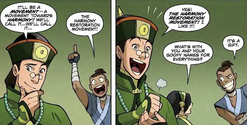 Then Zuko tells us what happened to make him change his mind on the Harmony Restoration Movement.