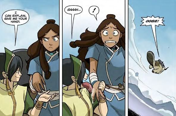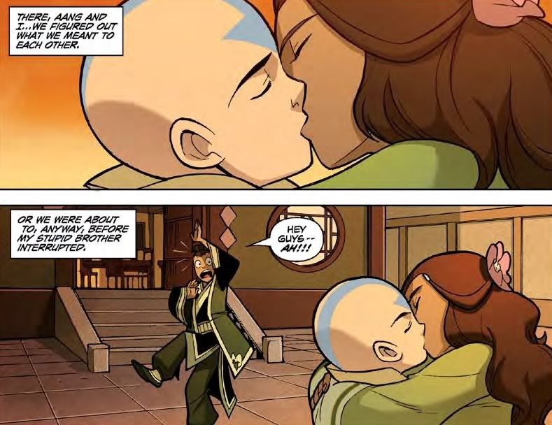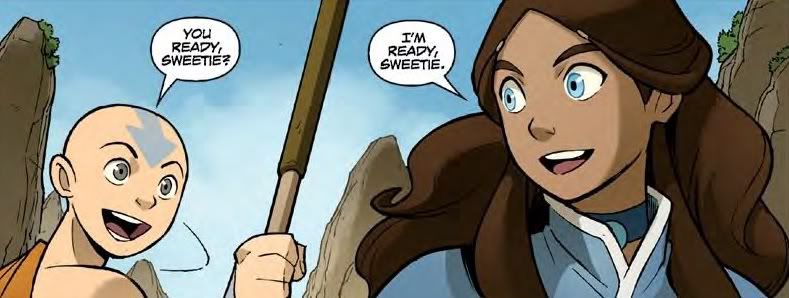 I don’t know why, but the Aang/Katara relationship is just icky. Toph and Sokka don’t leave this ‘Sweetie’ comment untouched.