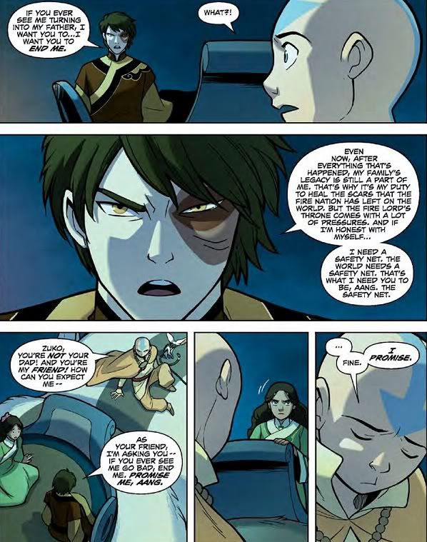 So Aang, Katara, Sokka, Toph, Zuko and Sokka’s girlfriend Suki all go out for a flight while the Earth Kingdom celebrates the Movement with fireworks. Everybody’s having tons of fun, except for sourpuss Zuko. Aang tries to get him to smile, and it’s here that Zuko wants the titular promise from Aang: Zuko wants Aang to kill him if Zuko ever shows signs of turning into a monstrous dictator like his father.