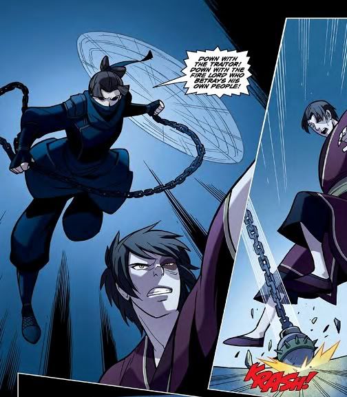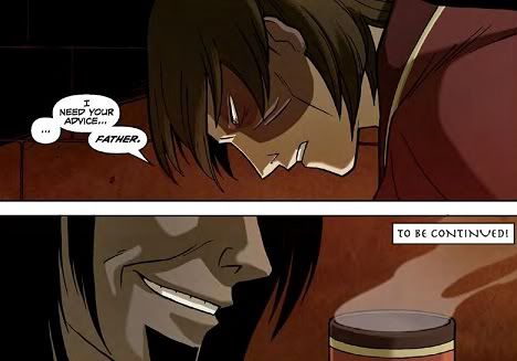 The mayor’s words flash us back to one of the epilogues of the cartoon show, when Zuko went to visit his father in prison and asked about his mother. The rest of the scene plays out in this comic, with Ozai being a sneaky bastard. He doesn’t answer Zuko, instead suggesting that Zuko is going to need his advice one day. Ozai wants to control his son from behind prison bars.