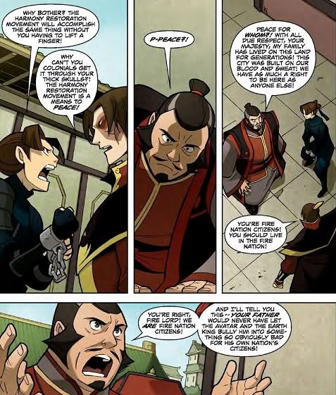 But when everyone arrives at the Fire Nation, the guards order the colonists to return to the Earth Kingdom. By order of Fire Lord Zuko, the Fire Nation has pulled out of the Harmony Restoration Movement!