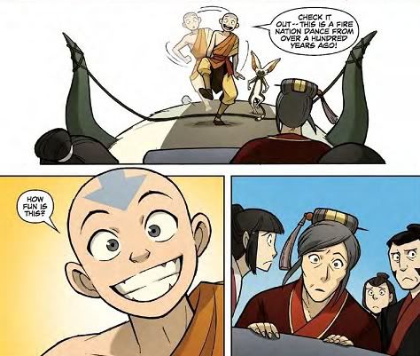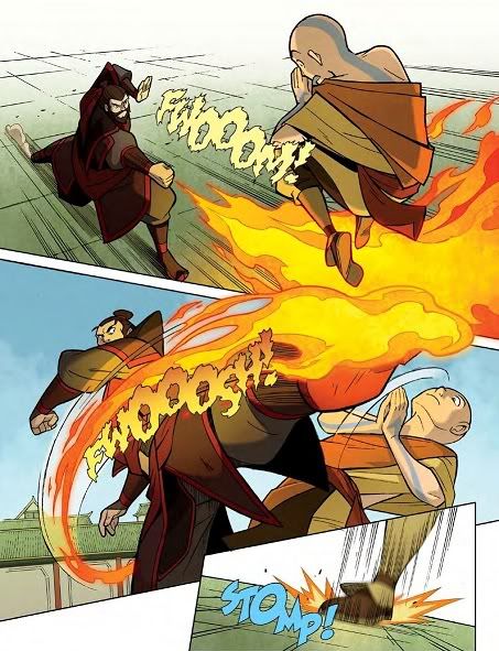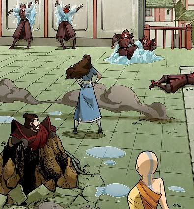 It’s still kind of cool to see Aang at the height of his skill though. He’s quite badass, even if he’s not kicking ass. But that’s what Katara is standing around for. After Aang gives these guards a few minutes, Katara decides that she’s had enough and just takes them all out with waterbending. It’s an appropriately awesome scene. One of those where each panel is a single word: “Stop. Trying. To. Set. My. Boyfriend. On. Fire!” The results speak for themselves.