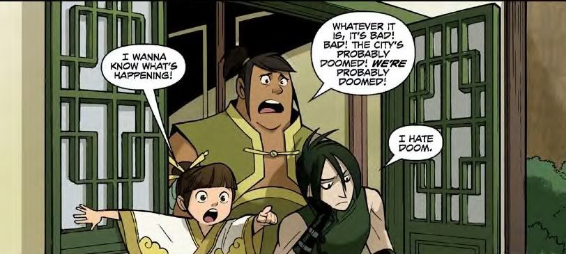 They also make a Sokka boomerang joke. But frankly, the joke isn’t funny and Sokka is completely wasted in this comic. He never does anything important or cool, and all his usual Sokka jokes fall incredibly flat. Clearly the writer couldn’t think of any specific role for Sokka to play, but they couldn’t exactly ditch him from the story.