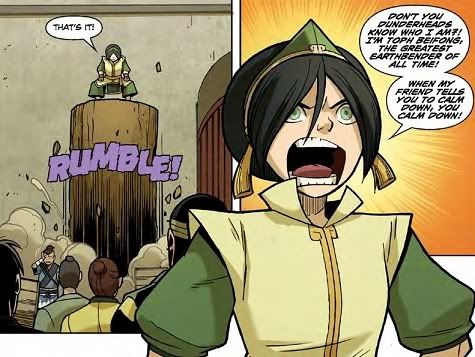 Outside, Smellerbee and the other protesters are getting anxious and angry that nothing seems to be happening. Sokka gets hit with a rock, and then Toph gets a moment to be badass.