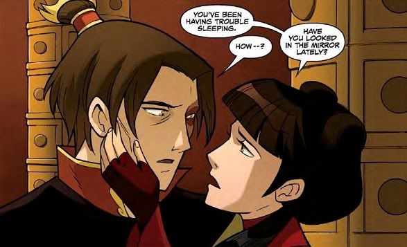 Then we cut to the Royal Palace at the Fire Nation capital, where Zuko is lost in thought. His girlfriend Mai pays him a visit, and she seems a lot more caring here than she ever did in the show. But then perhaps I just miss her wonderful deadpan, emotionless voice. She berates Zuko for not telling her that he left. She had to find out that he was in the Earth Kingdom from the fliers that were being posted around the Fire Nation. She tells him that he needs to be open with her, that he can’t just bottle everything up.