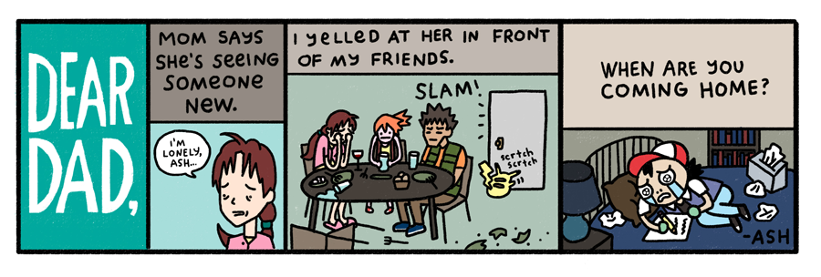 I found these comics by artist Mare Odomo while randomly surfing the Internet today, and they are brutally hilarious. You kind of have to know a bit about Pokemon to get the dark humor, and about the cartoon show. But I do know, so I found these to be utterly brilliant. Basically it’s the protagonist and pokemon trainer Ash writing letters to his absent father. Whatever happened to Ash’s father? Nobody knows! He’s never mentioned on the show, I don’t think ever. Hence why these are gust bustingly funny and horrible!