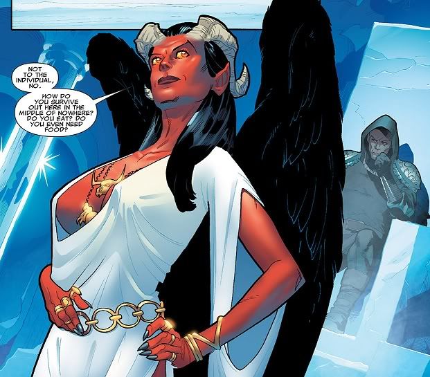 We open, like I said, in the Isolationist’s Arctic fortress. The demon woman stands revealed, and says that her name is Jezebel, and I believe she is from Hell.