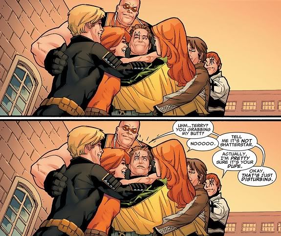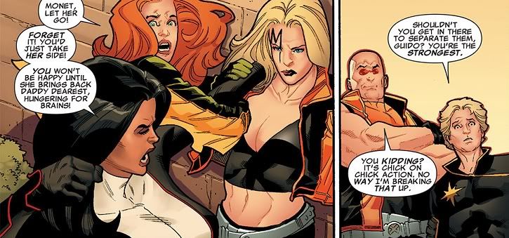 Though if anyone is paying attention, ever since Pip commented on Monet’s excessive cleavage a few issues back, she’s been zipping her costume all the way up. That’s a neat little change in character that some people might not even see. Hooray for subtlety in storytelling!
