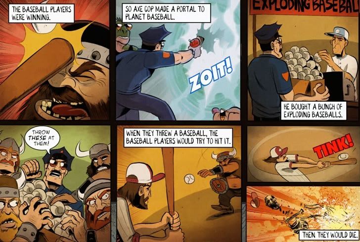 Comics: A fireaxe-wielding police officer uses a portal gun to get exploding baseballs so that his army of vikings can defeat an army of evil baseball players