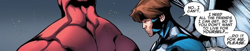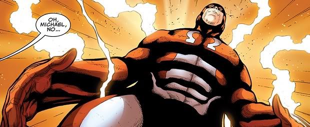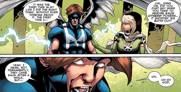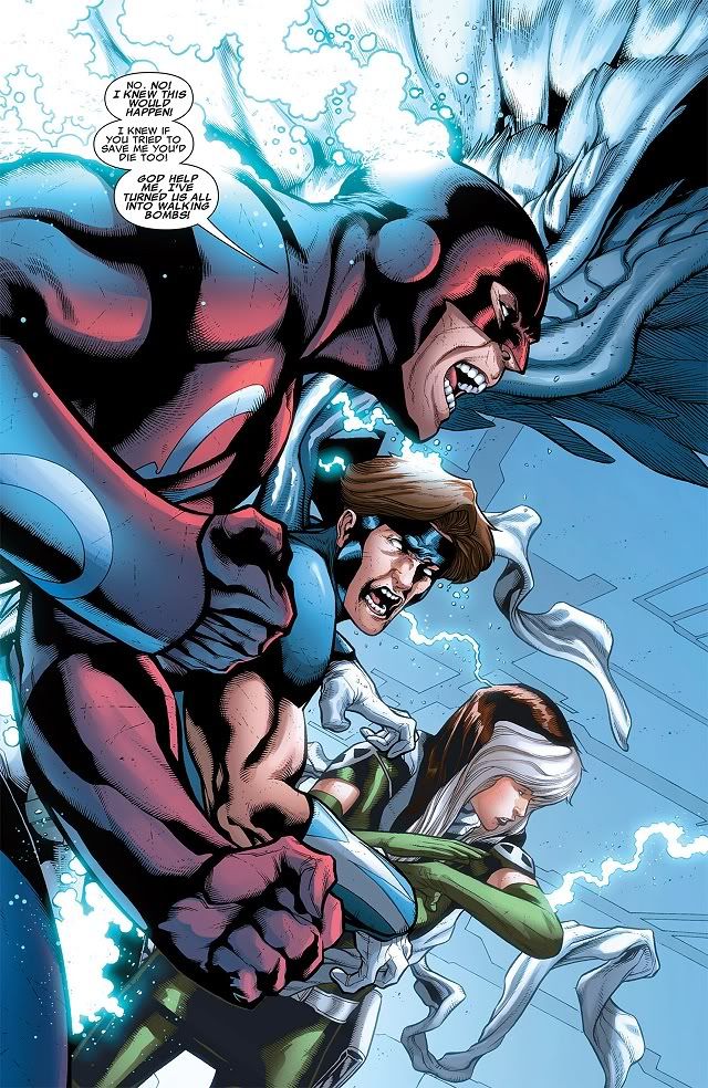 Omega has finally decided to do us all a glorious favor and kill himself. Seriously, does this guy have any fans? He was introduced a few years ago by killing Alpha Flight! Everybody loves Alpha Flight! Omega hasn’t done jack for anybody else since, always just languishing around because nobody wants to touch such a worthless, pathetic character. So rather than let Mimic’s excellent plan cure everybody, Omega just reabsorbed all of the explosion juice out of Rogue and Mimic. They’re gonna be fine, and Omega is totally fine with blowing up. Everybody wins.