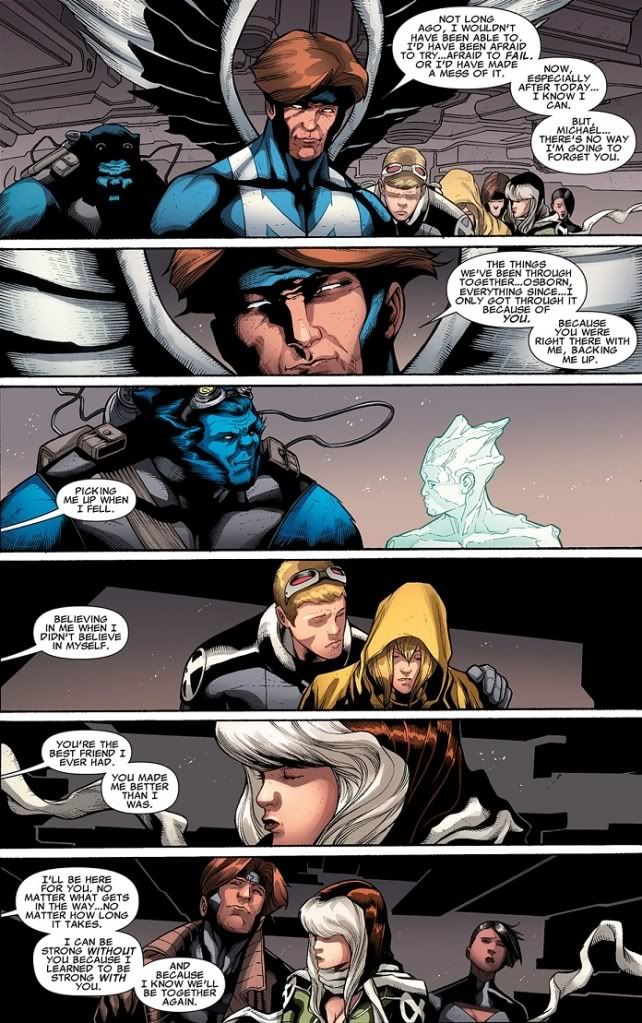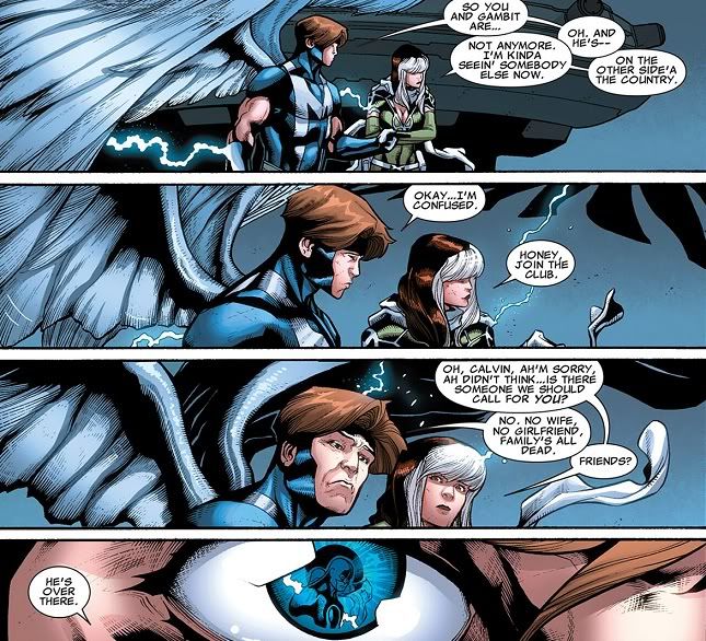 Everybody’s really sappy for a few more panels, as Rogue still refuses to tell Magneto she loves him, so she settles for another hug from Gambit. That guy just can’t let go, it seems. Anyway, Rogue says she has laundry to do, so could they just get this over with? That lady has her priorities straight. I hate leaving dirty clothes around the house too. Omega promises to buy them all drinks afterwards, so at least he’ll do something right.