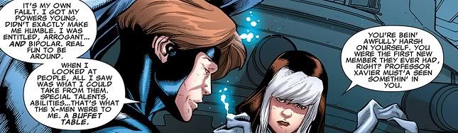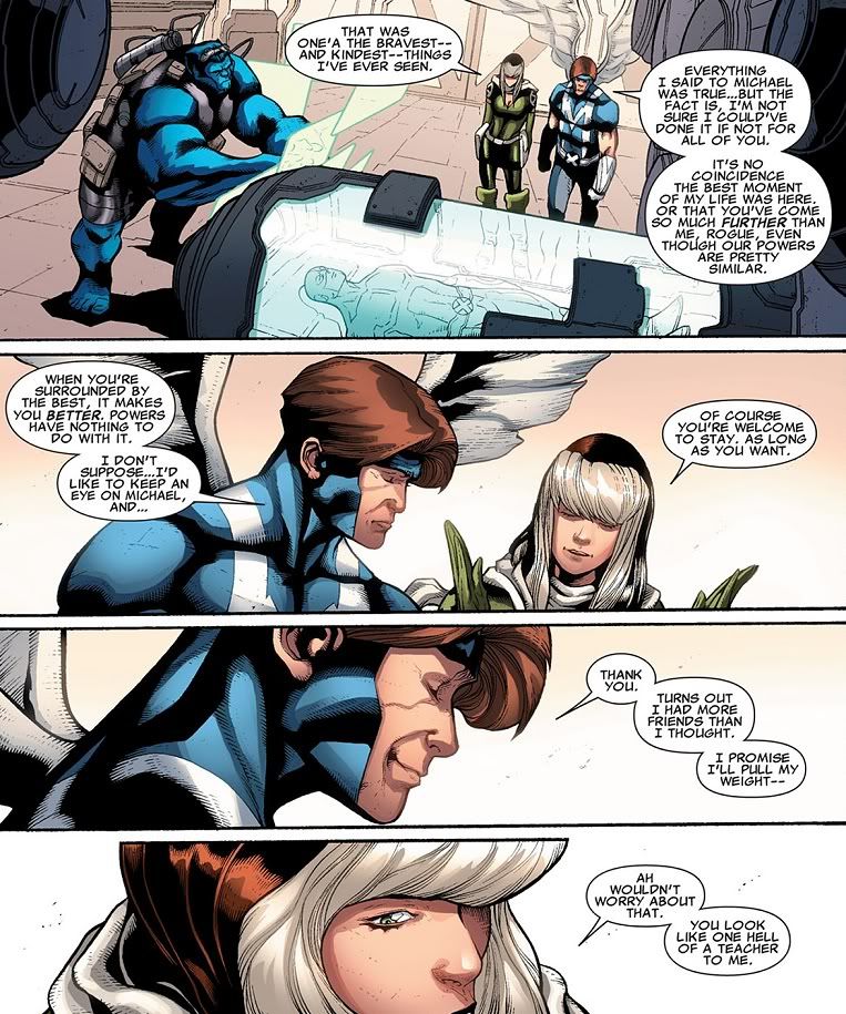Anyway, Rogue has her own little moment of cathartic release and her own flashback. What is this, Lost? But she drops some truth on Mimic about how being an X-Man and a teacher has helped her deal with her power absorption powers. These two are totally becoming BFFs! If Rogue weren’t into creepy, power-hungry old guys, Mimic might have a chance!
