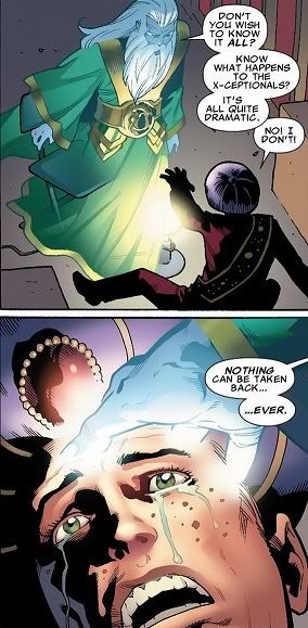 Multiple Man and Lord Defender show up just in time to watch the defeated Scattershot teleport back to the Mojoverse. Lord Defender mourns his dead friend Buzzkill, and then offers Alfonse a spot on the X-Ceptionals. But Alfonse blows him off and leaves. Lord Defender watches him go, and predicts that Alfonse will come around. And there’s one way to know for sure, they can just ask Far Sight. He knows things.