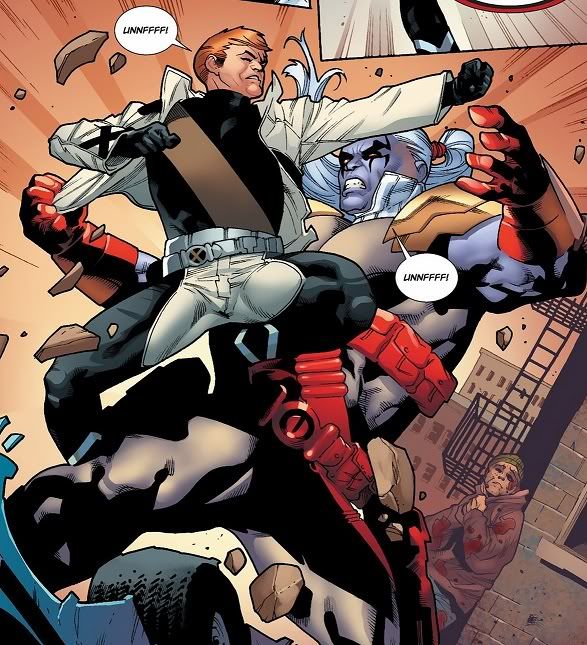 Scattershot still has his gun trained right on Shatterstar, but the acrobatic X-Factor guy easily dodges the first shot and the fight is on! The two duel back and forth, bantering all the while. It’s a typical fight. Scattershot shoots some cops who show up, Shatterstar slices through a car that’s thrown at him with his double blades. It’s a fight. I’m not going to give you the play-by-play. Nothing about it is particularly badass, the art is serviceable and the dialogue/banter is acceptable at best.