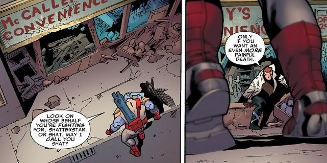 When Scattershot threatens to shoot Alfonse, Shatterstar promises to fight with honor, and retracts his blades. Scattershot seems to like that, and he holsters his gun. They continue fighting. Scattershot introduces himself and reveals that he was sent by Mojo, which angers Shatterstar. More fighting and bantering.