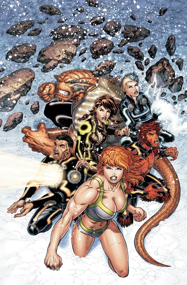 Red Robin plans to lead the Titans in a direct attack on Harvest, leaving time for the Legion to destroy the facility and Ridge and Fairchild to get everyone else to safety. I never read Gen 13 back in the 90s, but I think this has been a fun use of Fairchild so far. There’s a brief moment where Red Robin shakes hands with Tyroc, leader of the Legion. I get what Lobdell and scripter Tom DeFalco are going for here, but since character development has been pretty nil, there’s no real impact in the handshake.