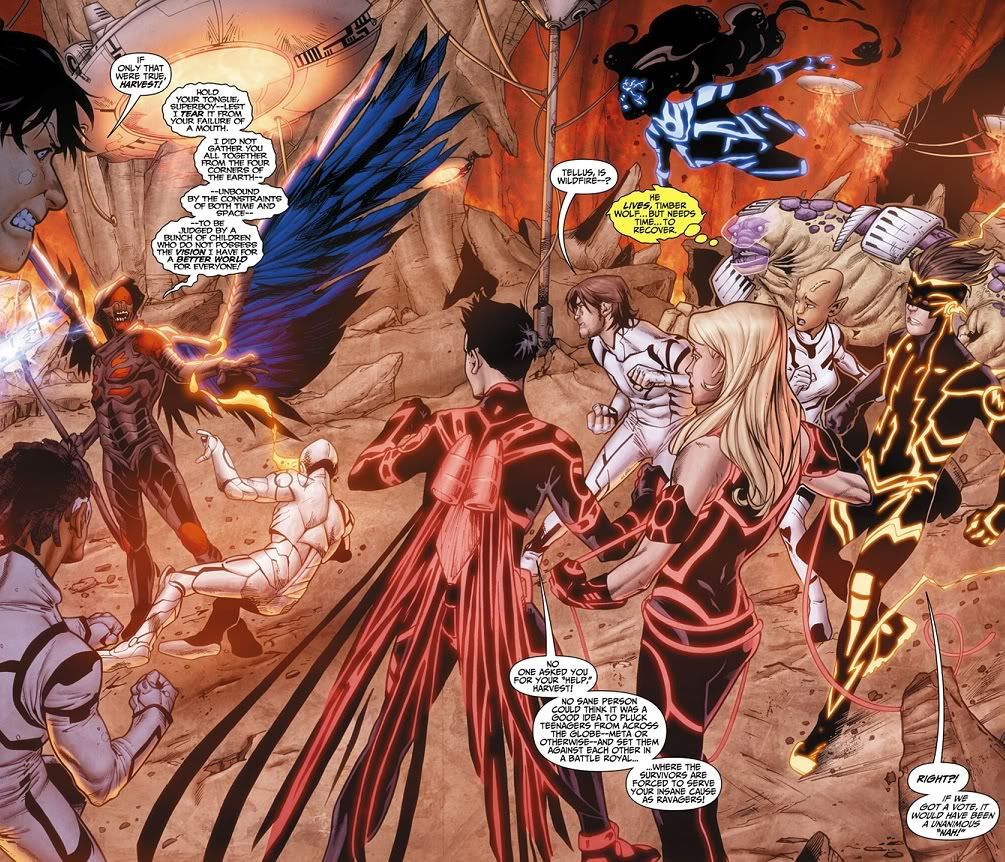 Then Harvest reveals that he planned for the eventuality of superheroes disrupting his operation, in another arrogantly annoying segment. Harvest tells the Titans that they may have freed the kidnapped metahumans, but now all those teenagers are running loose after having lived in horrible, monstrous conditions the past few months. They’ve all been forged into violent, uncontrollable threats. Soon the world will be begging for N.O.W.H.E.R.E. to come and collect these dangerous teenagers.