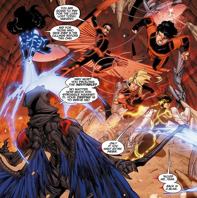 Meanwhile, the Titans continue to battle Harvest while Legion destroys N.O.W.H.E.R.E.’S power core, which they realize had to have come from their timeline in the 30th century. Whatever, they can deal with it in their own comic. I’m only concerned about the Teen Titans. They manage to hold their own against Harvest, but like I said, he’s pretty much untouchable, no matter the Titans’ bravado.
