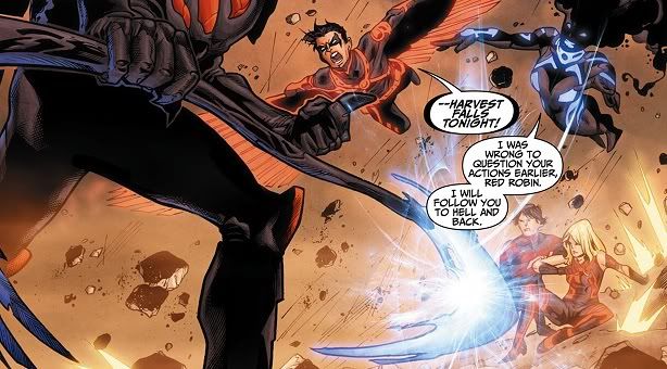 Red Robin makes a last desperate attempt to catch Harvest. It’s another wannabe dramatic moment that would carry more weight if more work had been done to flesh out Red Robin and Harvest as characters.