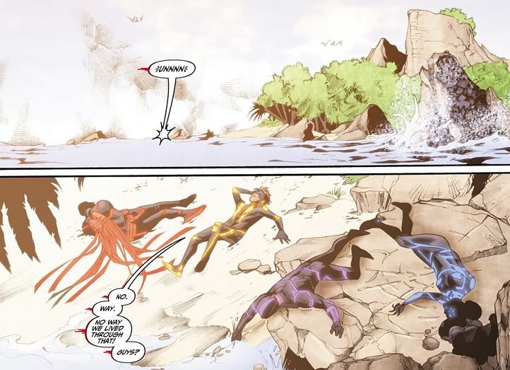 Superboy and Wonder Girl lead the charge, using their powers to carry the whole team to safety. Since the exploding power core is above them, they burrow downward deeper into the Earth.